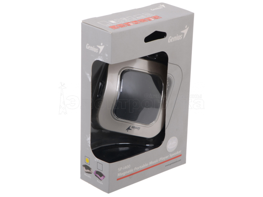 Уникальное устройство от компании Genius, сочетающее в себе функции компактного MP3-плеера и колонки. Данная модель поддерживает использование карточек памяти SD, а также работу с файлами, имеющими расширение MP3 и WMA. Мощность динамика Genius SP-i400 Metallic – два ватта. Устройство оснащено литиевой батареей. Длительность работы в автономном режиме – около восьми часов. Главным преимуществом этих колонок считается наличие встроенного магнита. Это предоставляет возможность крепить их к металлическим поверхностям, корпусу ПК, на стену и пр. Дополнительно в комплекте поставляется подложка с клейкой основой. Благодаря этому колонки можно прикрепить даже к неметаллическим поверхностям. Модель Genius SP-i400 поддерживает возможность объединения нескольких подобных устройств в единую аудиосистему. Это позволяет пользователям максимально увеличить громкость и получить более объемное звучание. Колонки оснащены стандартными разъемами 3.5 мм. Таким образом, к ним можно подключать мобильные телефоны, iPad, iPod и