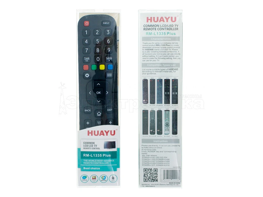 Универсальный пульт Huayu RM-L1335 PLUS для телевизоров Hisense. Пульт превосходного качества, он легко настраивается нажатием пары кнопок. Инструкция на русском языке и список поддерживаемых пультов в комплекте. Список моделей заменяемых пультов: EN2B27 ER-31607R ER-22655HS ER-22642R ER-22641R EN-22652A EN2H27B EN2H27HS EN2S27D EN-31906D EN-31906D EN-31603B EN-21662B EN-32963HS EN-31603A ER-32961HS EN-21662 EN-31907 ER-22654 ER-22601A