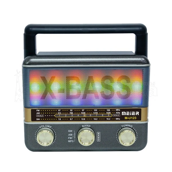 FM: 87-108 MHz AM: 513-1629 KHz SW: 7.8-16.2 MHz LED подсветка в такт музыке Разъёмы: USB, TF(до 32Гб), AUX - 3.5мм Питание: аккумулятор встроенный / АС-220В - шнур в комплекте/ 2*R20 (в комплект не входят) Гнездо miniUSB 5B для заряда аккумулятора Размер: 17 х 13 х 7 см