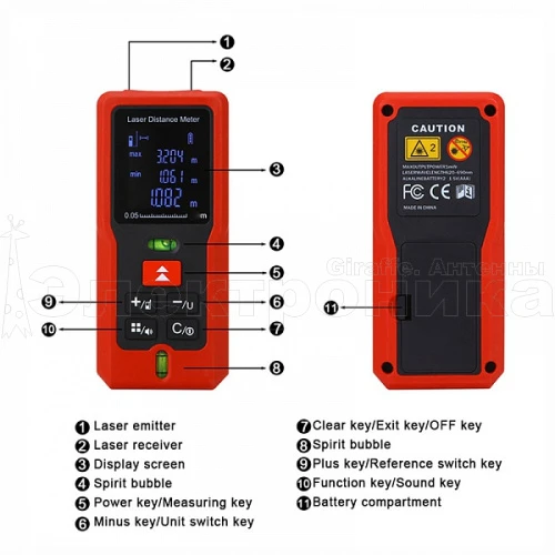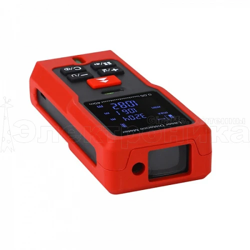 Дополнительные функции дальномера: режим непрерывного измерения, измерение максимальных и минимальных расстояний, измерение различных площадей с одним общим параметром. В памяти дальномера можно сохранять до 20 результатов измерений.