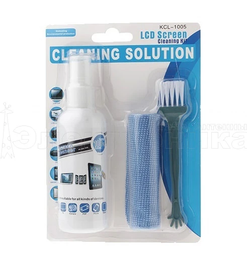 Набор для чистки мониторов, экранов ТВ, объективов, смартфонов и т.п. В комплекте: 1) кисточка 2) салфетка из микрофибры 13 х 13 см 3) универсальны спрей для чистки 100мл. - не содержит спирт, антистатический эффект
