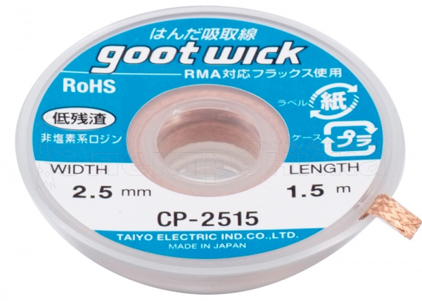 Высококачественная медная оплетка профлюсована флюсом класса «RMA». Особотонкое плетение. Обеспечивает деликатное удаление припоя при выпаивании радиокомпонентов на печатных платах. Рекомендации к применению: Приложить оплетку к месту, где требуется удалить припой, и сверху поднести жало паяльника. В процессе нагрева припой впитывается в оплетку за счет капиллярного эффекта. После выполнения работ необходимо отрезать насыщенную припоем часть оплетки. Диаметр: 2,5 мм Длина: 1,5 м Вес: 16 г