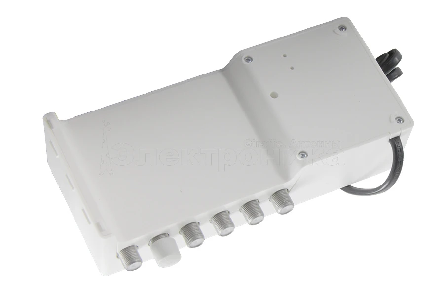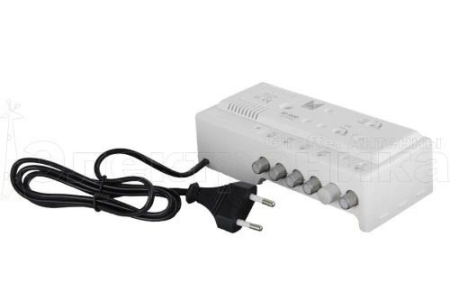 Телевизионный усилитель сигнала с раздельной регулировкой уровней сигнала по метровым и дециметровым поддиапазонам. Оснащен четырьмя выходами и встроенным блоком питания. Для подключения кабеля применяются F-разъемы.